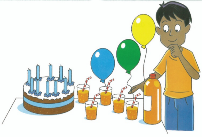 It is Suni's tenth birthday party. Identify two solids, two gases and one liquid on his birthday table.