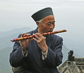 People make music from woodwind instruments by blowing down or across the tops of hollow pipes. This makes the air vibrate inside the pipe to make a sound.