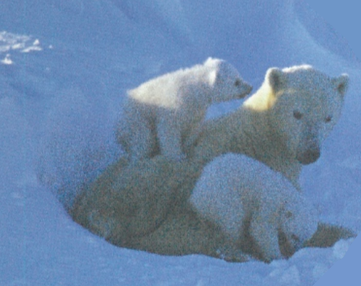 Two polar bear cubs with their mother at their den