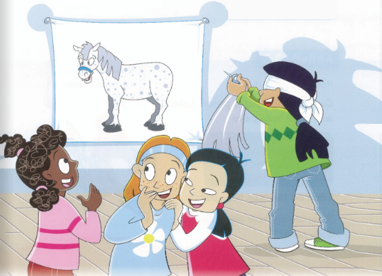 She is playing a game to pin the tail on the horse.