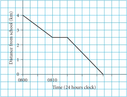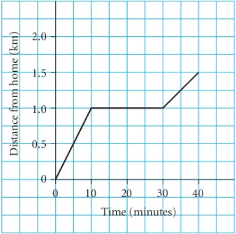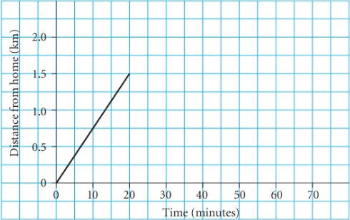 • The bus does not come. He starts walking again. After a total of 40 minutes he is $1/5 km$ from home.