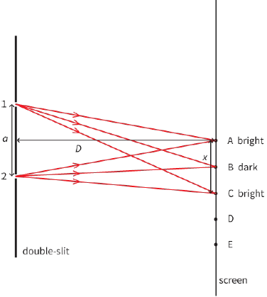 This point is slightly to the side of point A, and is the midpoint of the first dark fringe. Again, two rays of light arrive at B, one from each slit. The light from slit 1 has to travel slightly further than the light from slit 2, and so the two rays are no longer in step. Since point B is at the midpoint of the dark fringe, the two rays must be in antiphase (phase difference of ${180^ \circ }$). The path difference between the two rays of light must be half a wavelength, and so the two rays interfere destructively.