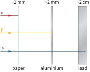 Table 15.4 shows the basic characteristics of the different types of radiation. The masses are given relative to the mass of a proton; charge is measured in units of e, the elementary charge. Figure 15.10 summarises the penetrating powers of the different types of radiation.
