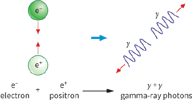 When an antiparticle meets its particle, such as a positron meets an electron, they annihilate each other and two gamma ray photons are produced and the two masses become pure energy!