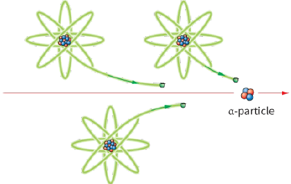 $\alpha - $particles are relatively slow moving and large particles. They were identified as helium nuclei (${H^{2 + }}$ ions) by their deflection in electric and magnetic fields (see Chapter 25). The helium nucleus, which consists of two protons and two neutrons, is extremely stable. Scientists believe that, within larger nuclei, $\alpha $ groups are continually forming, breaking apart and reforming. Occasionally, such a group will have enough energy to break away from the strong nuclear forces holding the mother nucleus together and will escape as an $\alpha - $particle. The $\alpha - $particles (which are relatively large and carry a charge) interact with atoms in the medium through which they are travelling, causing ionisation within the medium. They lose energy rapidly. This means they are not very penetrative (they are absorbed by a thin sheet of paper) and have a very short range (only a few centimetres in air).
