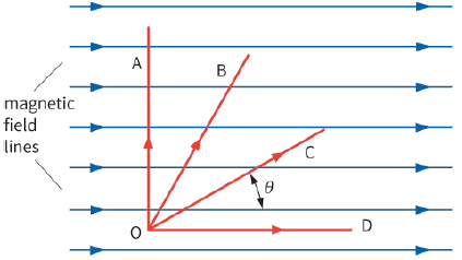 Now we must consider the situation where the current-carrying conductor cuts across a magnetic field at an angle other than a right angle. In Figure 24.20, the force gets weaker as the conductor is moved round from OA to OB, to OC and finally to OD. In the position OD, there is no force on the conductor. To calculate the force, we need to find the component of the magnetic flux density B at right angles to the current. This component is $B\sin \theta $, where $\theta $ is the angle between the magnetic field and the current or the conductor. Substituting this into the equation $F = BIL$ gives: