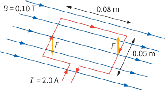 1) An electric motor has a rectangular loop of wire with the dimensions shown in Figure 24.19. The loop is in a magnetic field of flux density $0.10 T$. The current in the loop is $2.0 A$. Calculate the torque (moment) that acts on the loop in the position shown.