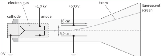 9) This diagram shows an electron tube. Electrons emitted from the cathode accelerate towards the anode and then pass into a uniform electric field created by two oppositely charged horizontal metal plates.
