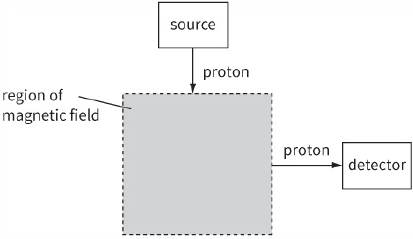 7) This diagram shows an arrangement to deflect protons from a source to a detector using a magnetic field. The charge on each proton is $+e$. A uniform magnetic field exists only within the area shown. Protons move from the source to the detector in the plane of the paper.